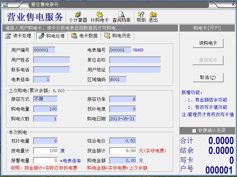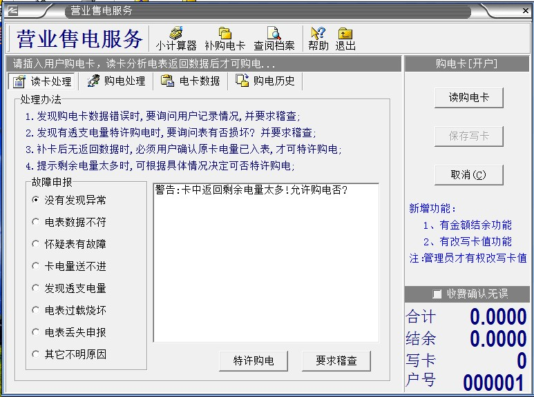 補卡操作完成后,請先將此卡插入被補卡的電表中,如電表顯示PO=**,表示補卡成功,這時才可以購電。