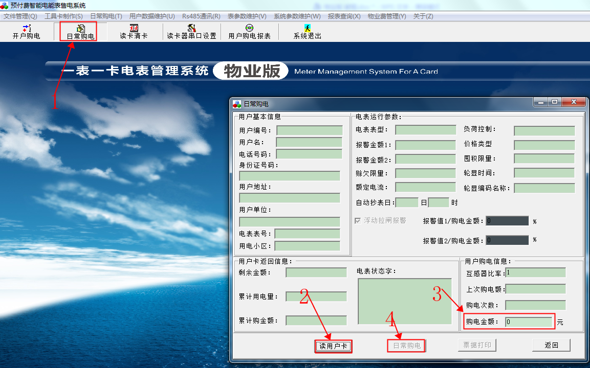 重新插張新卡到讀卡器,以上信息都根據自己要求設置好之后,單擊“開戶購電”。出現以下畫面。