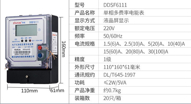 DDSF6111單相電子式多費率電能表,采用單片機處理系統設計而成,具有電路簡單、可靠性高、成本低等優點。該產品軟件、硬件、結構設計技術先進,計量精度高,結合單片機資源,實現電能分時計量,具有紅外及RS-485通信功能,抗干擾、防攻擊性能好,工作溫度范圍寬,能長期穩定可靠工作。該產品各項性能指標符合國家GB/T 17215-20021級和2級靜止式交流有功電能表》、GB/T 15284-2002《復費率(分時)電能表特殊要求》、DL/T 645-1997《多功能電能表通信規約》等標準的技術要求。